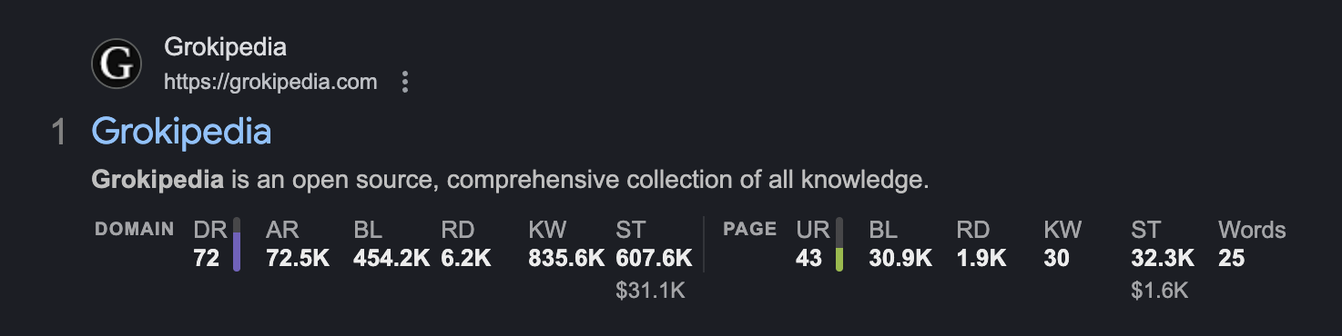 This alone already puts Grokipedia ahead of 99.9% of AI-generated content projects that never escape the “indexed but invisible” stage.